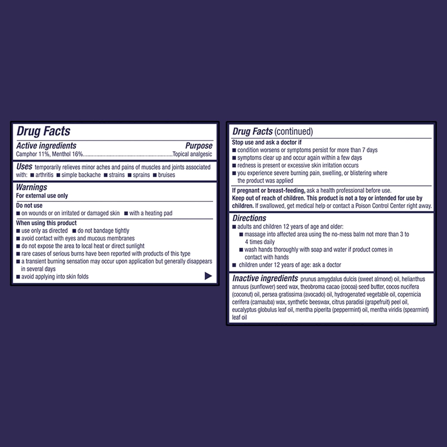 | Product Benefits | Two Max-Strength Pain Relievers: Menthol and camphor combine to relieve more points of pain |